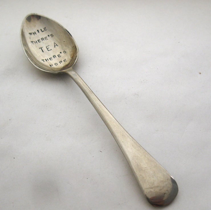A hand stamped vintage nickel silver alloy tea spoon with the words WHILE THERE'S TEA THERE'S HOPE.