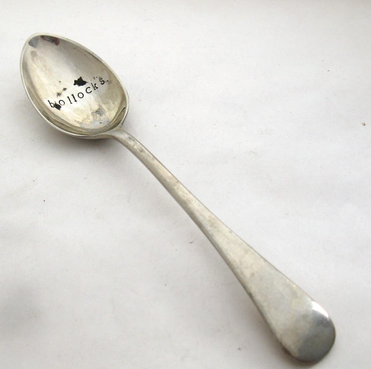 A vintage nickel silver alloy teaspoon with the single word 'b-llocks' hand stamped in the bowl. Because sometimes you just need a rude word on a spoon to cheer you up. The spoon is flawed and tarnished (and in the Bargain Bin) but you don't need a perfect shiny spoon for this particular message, do you?