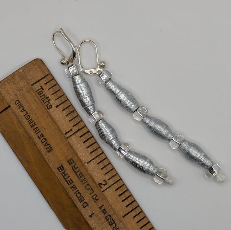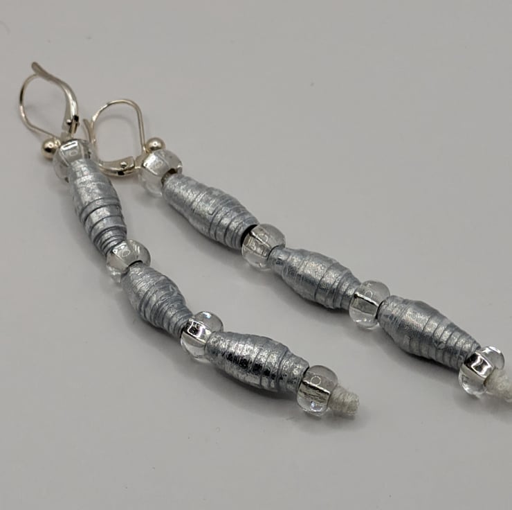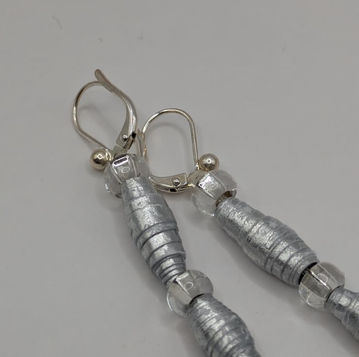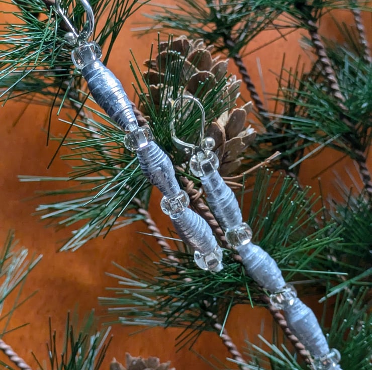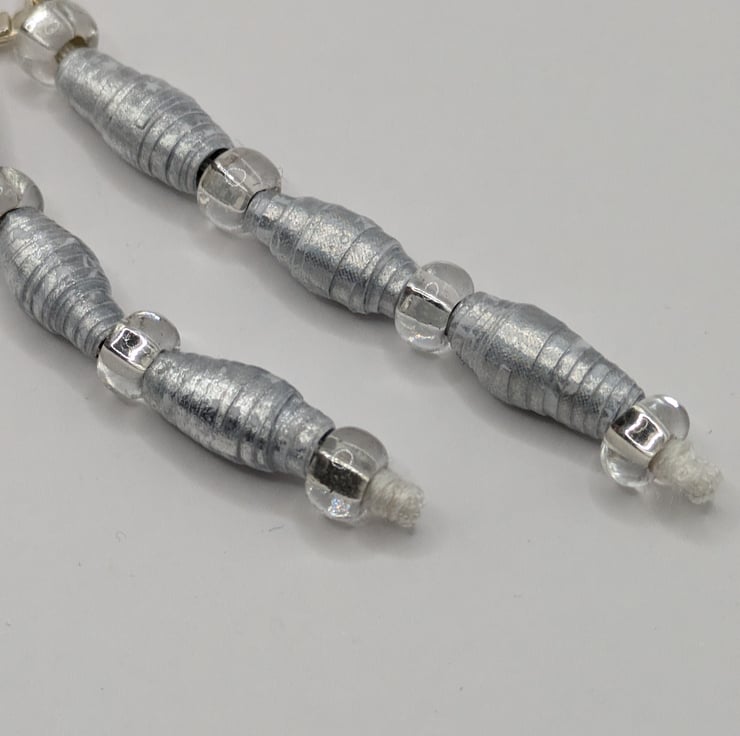 Handmade silver and white paper beads with clear spacers, threaded on white cord, roughly 6cm long. These festive earrings come with silver plated ear hooks.