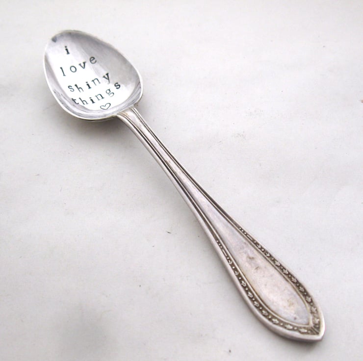 A hand stamped vintage silver plated coffee spoon that says 'i love shiny things' in lowercase lettering, coloured black with a water based acrylic ink (non-toxic). It's approx. 11cm long and has a pointy handle with a narrow detailed border. I've added a little heart below the wording.