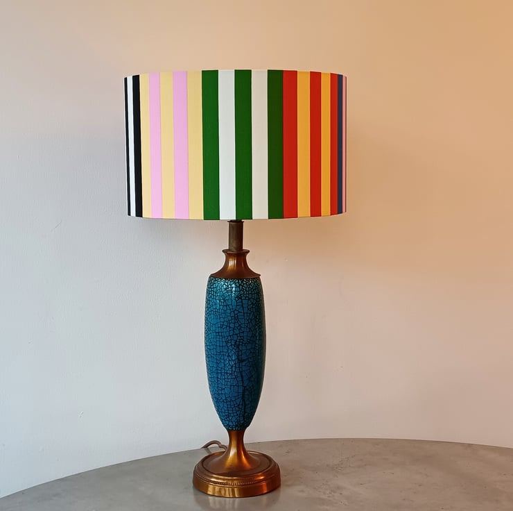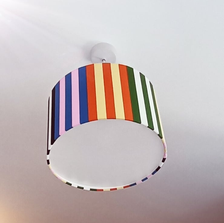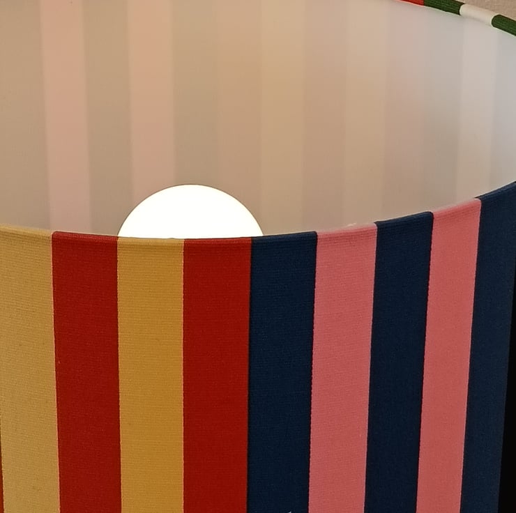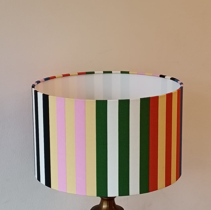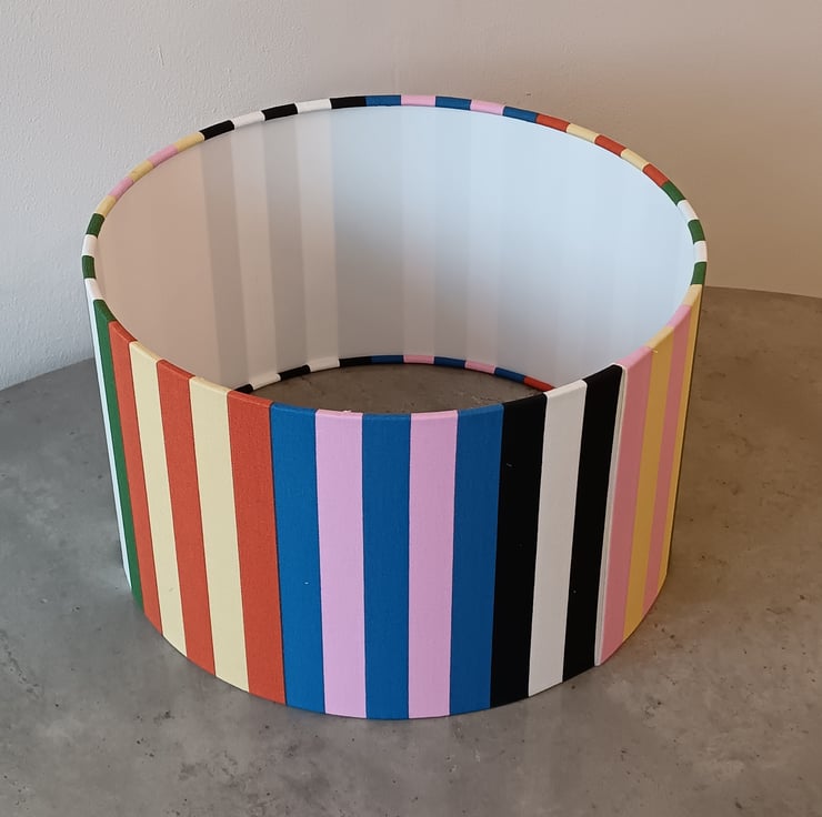 Stripy Ikea fabric covered drum lampshade suitable for use on a lamp base or as a pendant to hang from the ceiling. Great ice cream and earthy colours brighten up your whole room and look lovely on a wooden, glass or ceramic base.