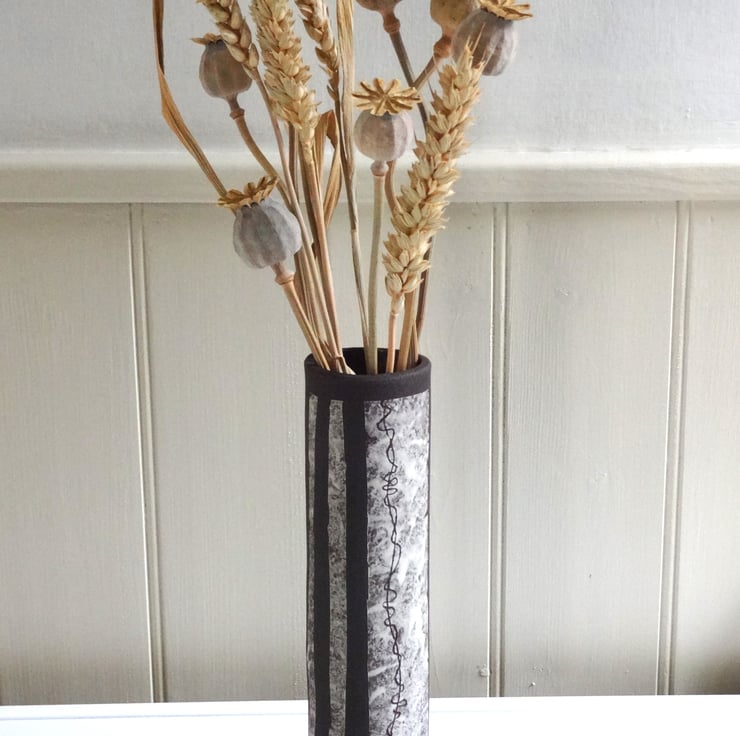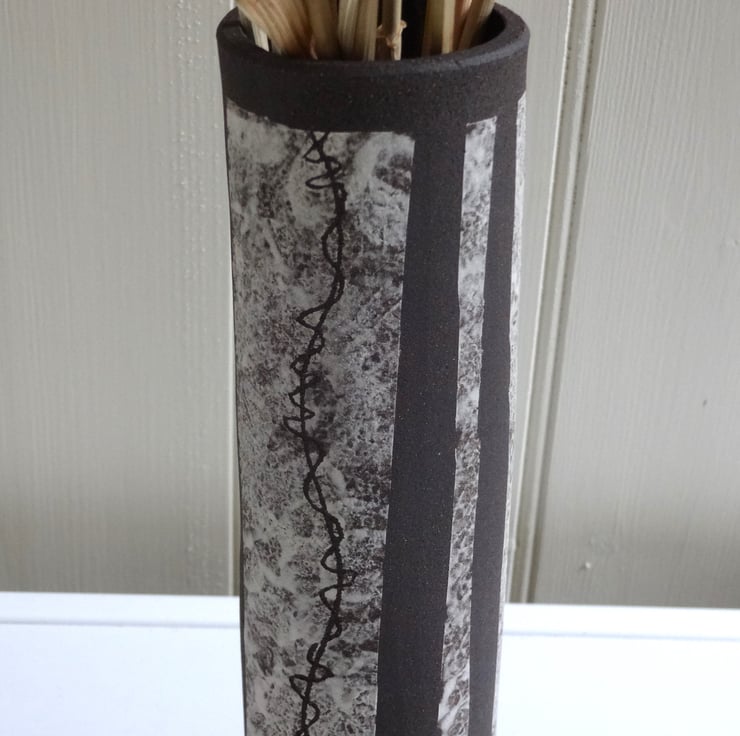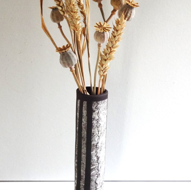 A slim modern ceramic vase for flowers or grasses from the garden or countryside. It adds a pretty centrepiece to your rooms, or makes a lovely birthday or housewarming gift. I shaped the vase in black stoneware clay, added panels of white slip and etched a twining design reminiscent of vine tendrils to give an unusual and eyecatching design. The interior is glazed in iron lustre finish with a surface gloss, while the rest of the vase is the natural matt finish of the black clay itself. 21cm tall x 5 cm diameter across the base. The base has my potter’s mark of a swallow in flight impressed into the clay before firing.