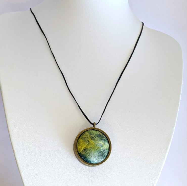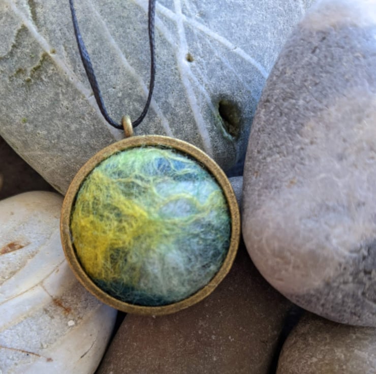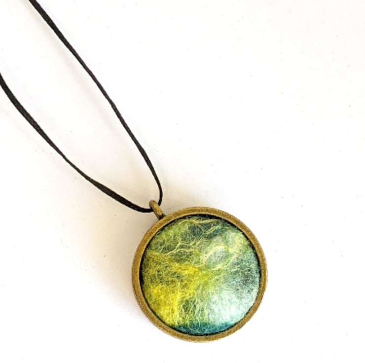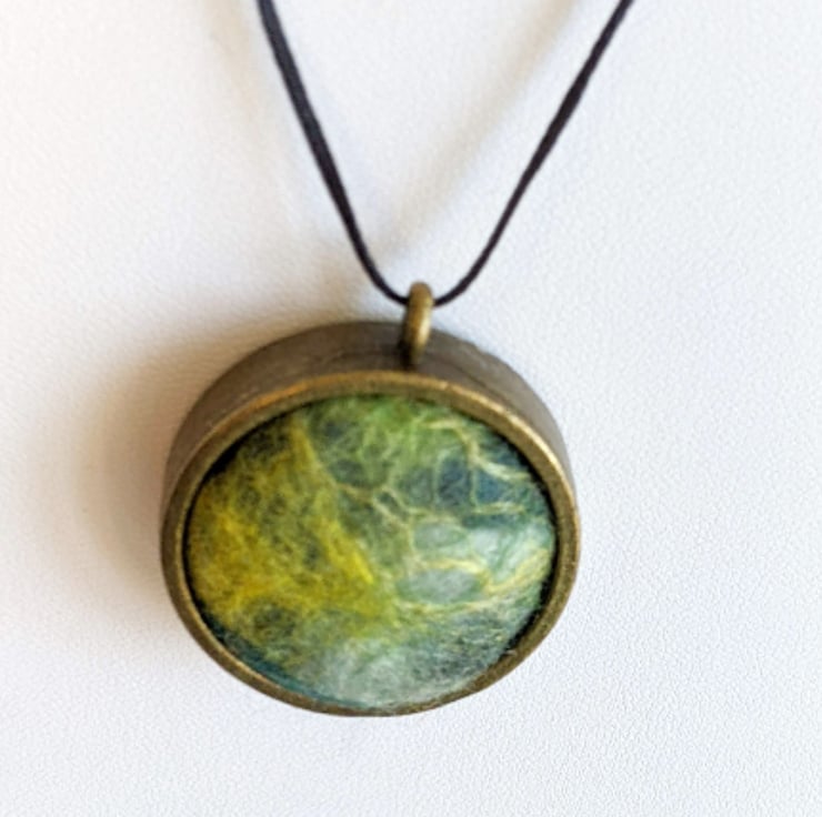 The pendant is a melange of green merino wools wet felted with highlights of yellow silk and bamboo fibres, firmly attached to a bronze coloured bezel.