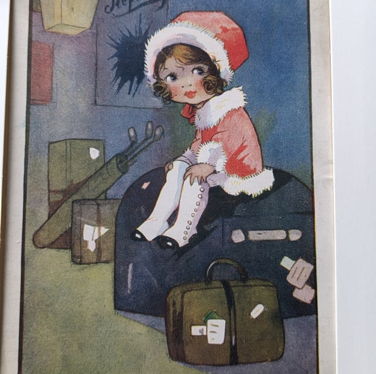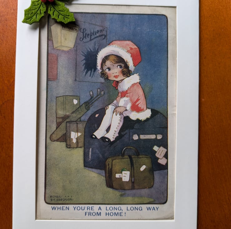 This one-off card is made from an original vintage postcard by Agnes Richardson, depicting a little girl sat on luggage, travelling home for Christmas. It is blank inside for your message.