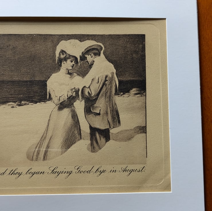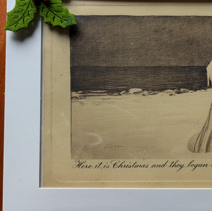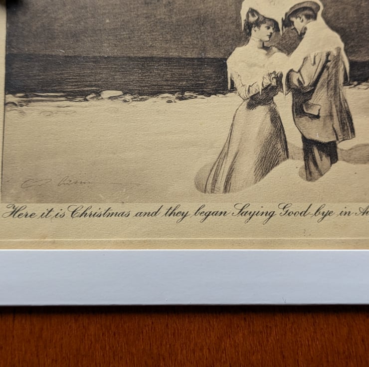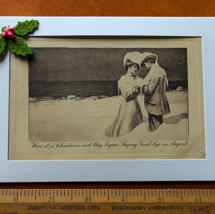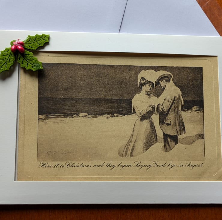 This one-off card is made from an original vintage postcard depicting a pair of sweethearts in a snow drift. It's captioned, " Here it is Christmas and they began Saying Good-bye in August". It' is blank inside for your message.
