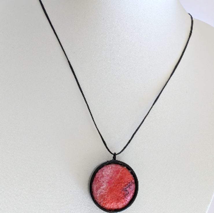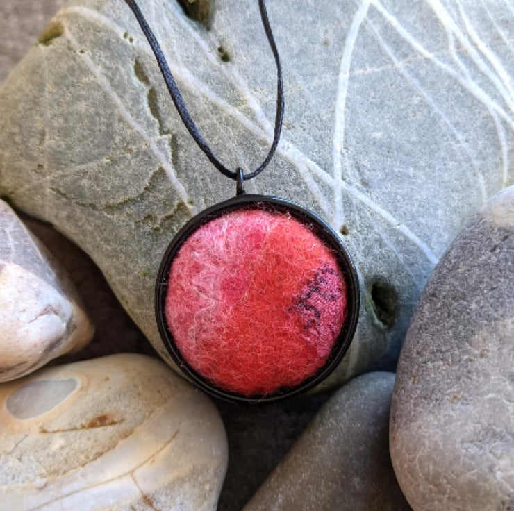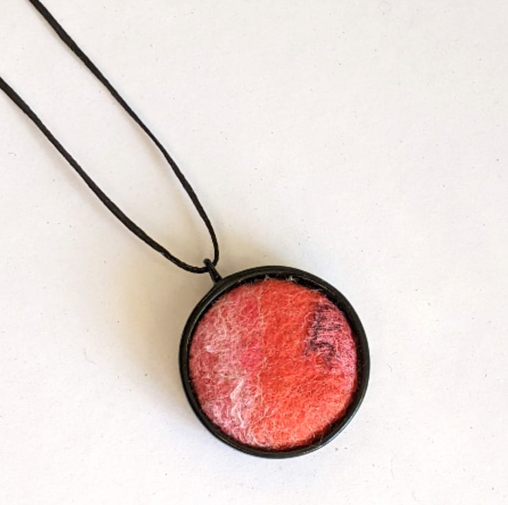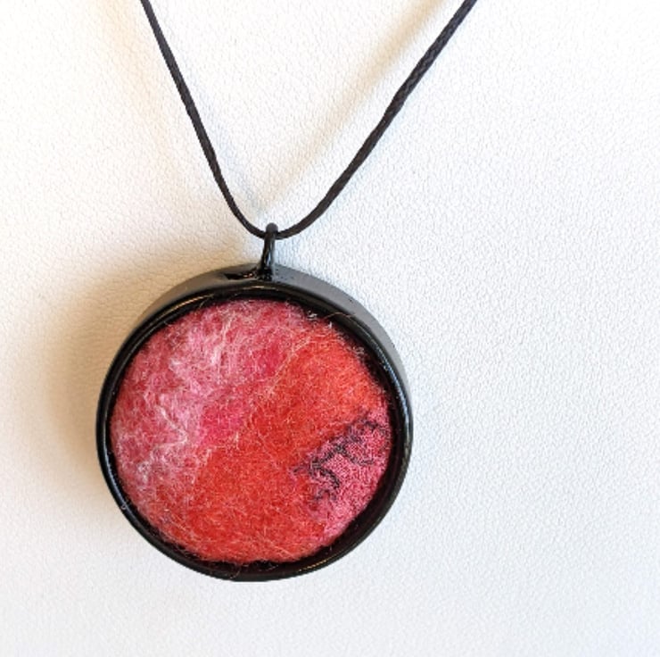 The pendant is a melange of red and pink merino wools, embellished with highlights of upcycled sari silk and silk fibres, wet felted together and firmly attached to a contrasting black bezel.