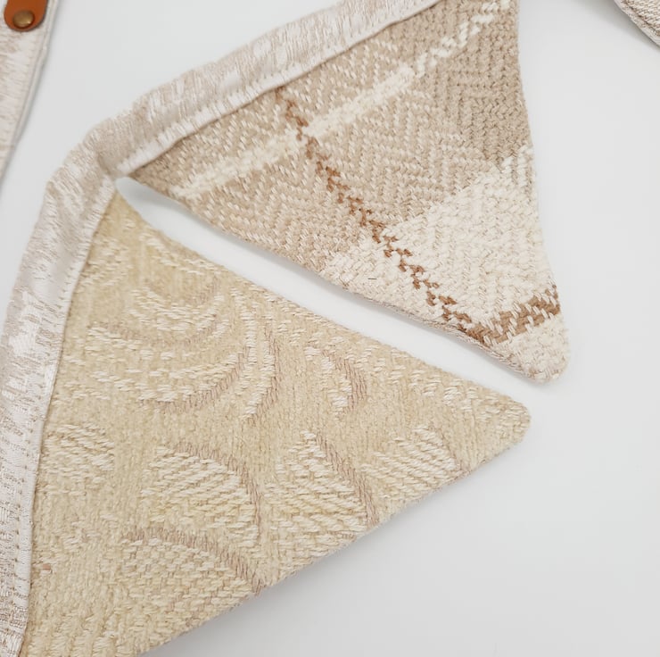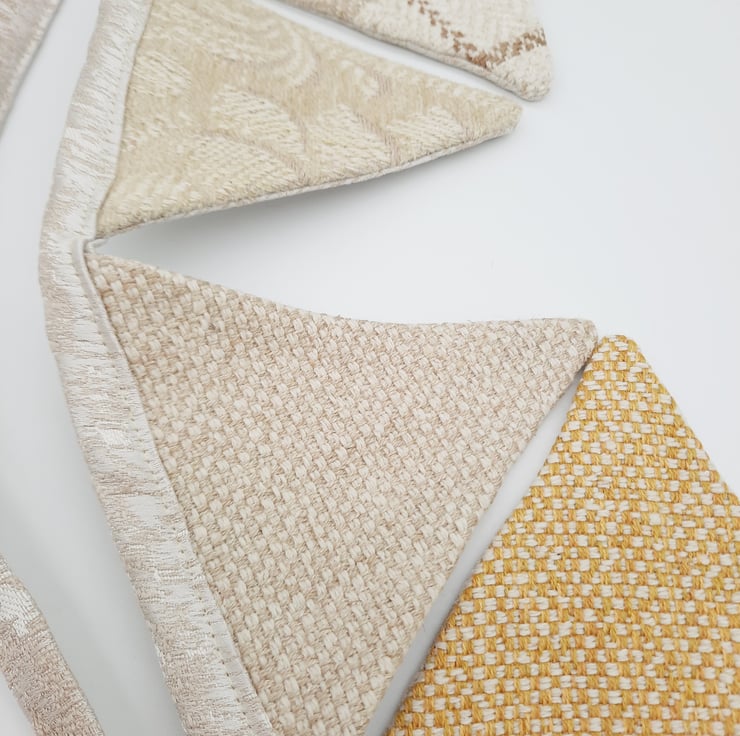 A golden yellow, cream and brown check, sand damask, beige damask and a striped embroidered leaf.