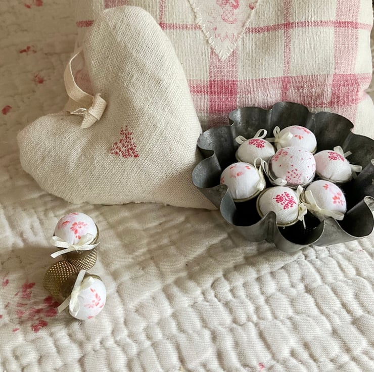 A tiny padded cushion, made from a vintage fabric, set into a vintage thimble. The rounded base has been flattened, so that it will stand and stay upright. Trimmed with a tiny silk ribbon bow.