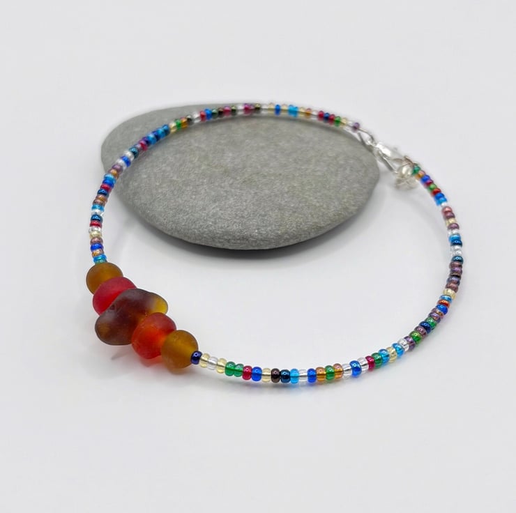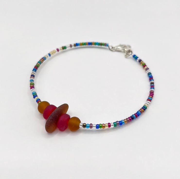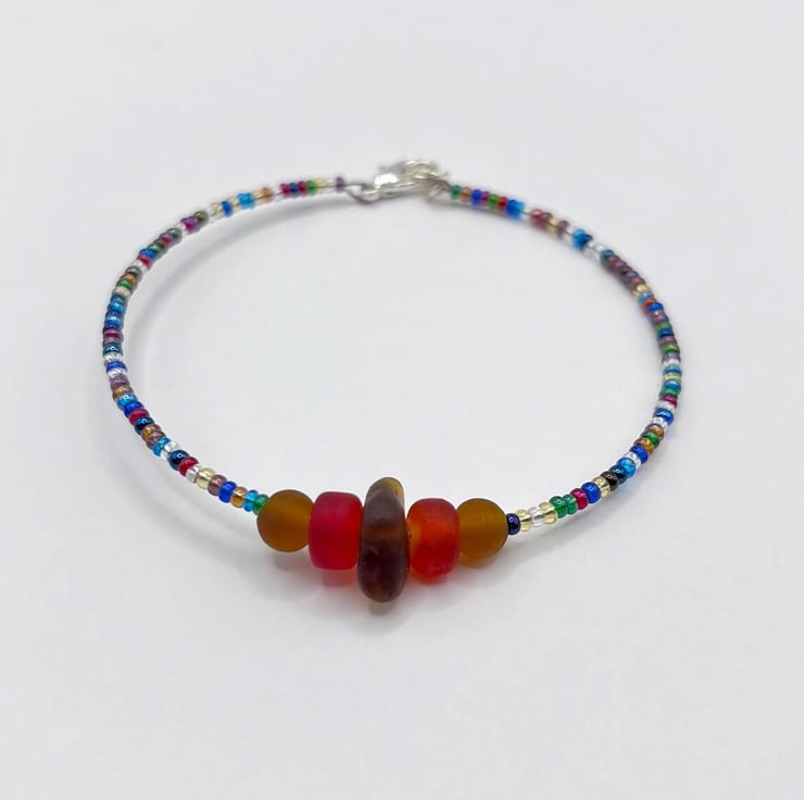Simple style bracelet with burnt orange coloured Cornish sea glass, matching frosted glass beads and a mix of multi coloured seed beads.
