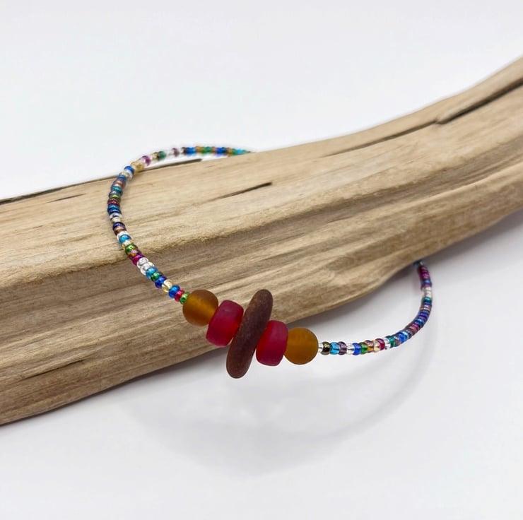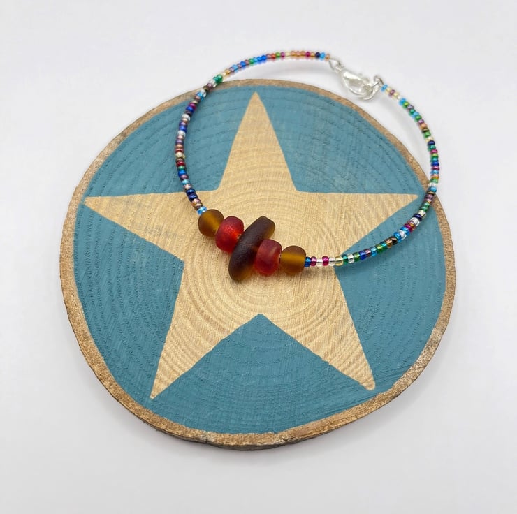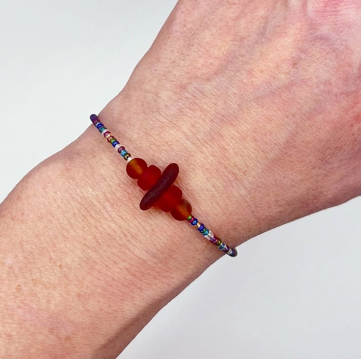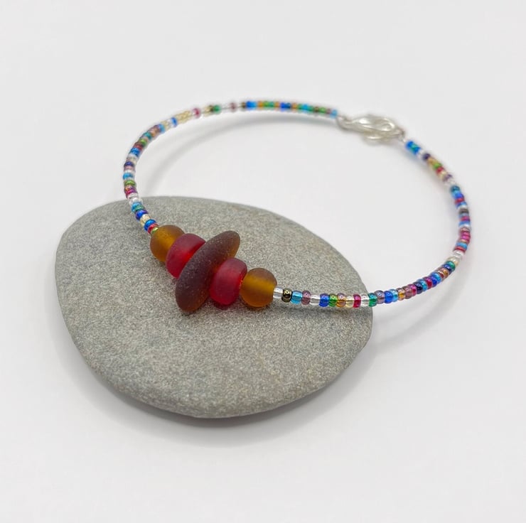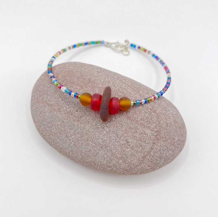 Burnt Orange Cornish Sea Glass Bracelet with Multi Coloured Mix Seed Beads