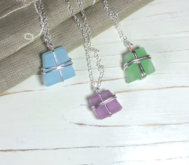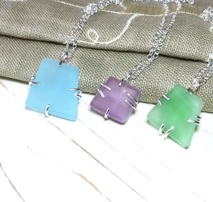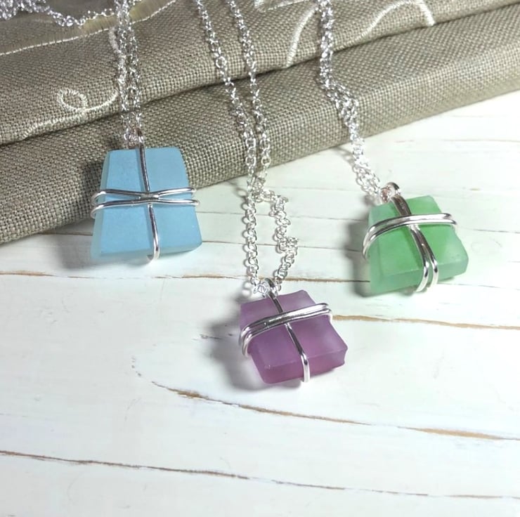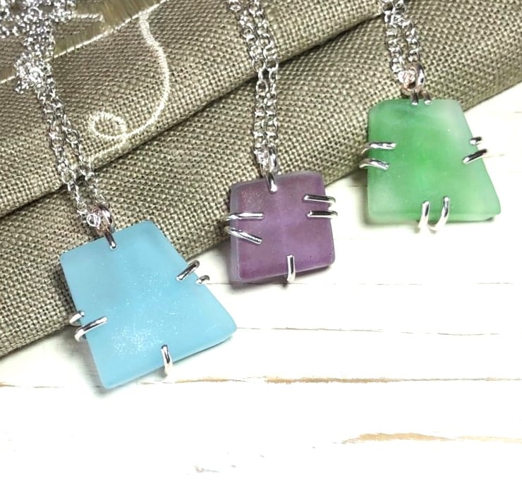 These pretty angular pendants are made using glass that has been given slightly frosted finish and come in a variety of lovely colours.