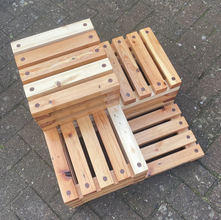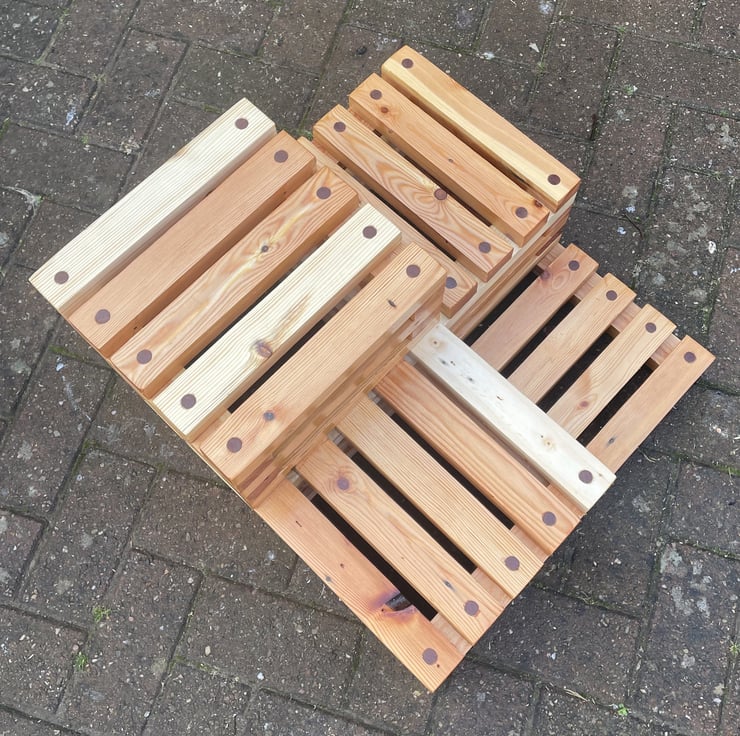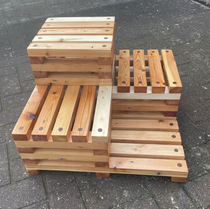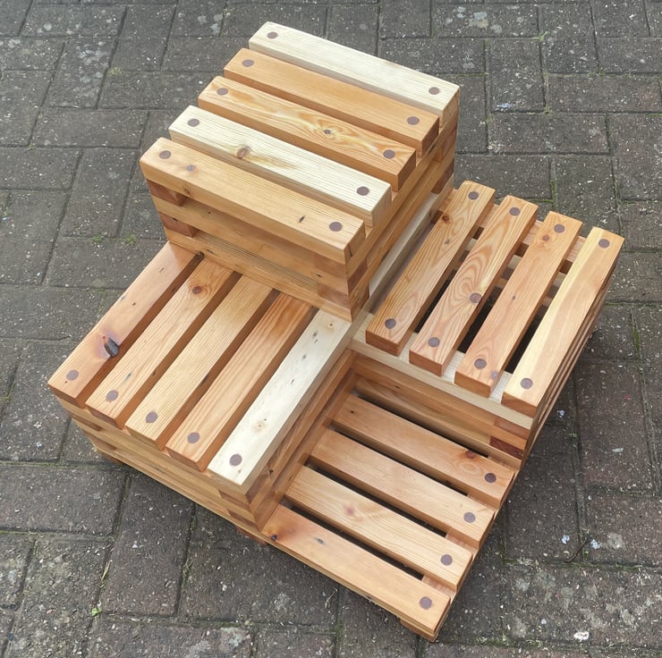 Many people have limited garden space, but still wish to display their plants to the best that they can. Therefore, my idea to facilitate this was to work upwards (i.e. multi layered platforms). One day, whilst rummaging for recycled wood, I saw some pallets stacked in such a way that they created different levels. It was from this image that this idea was born. To give it a unique look, I decided to create two colour contrast woods - pine and sapele.