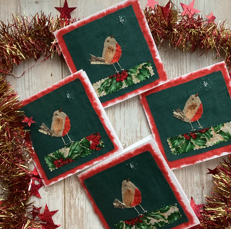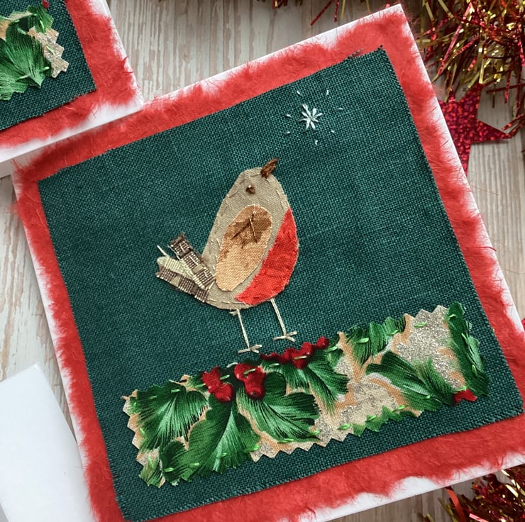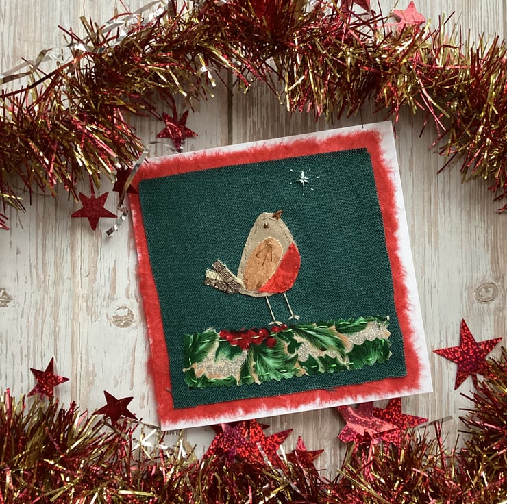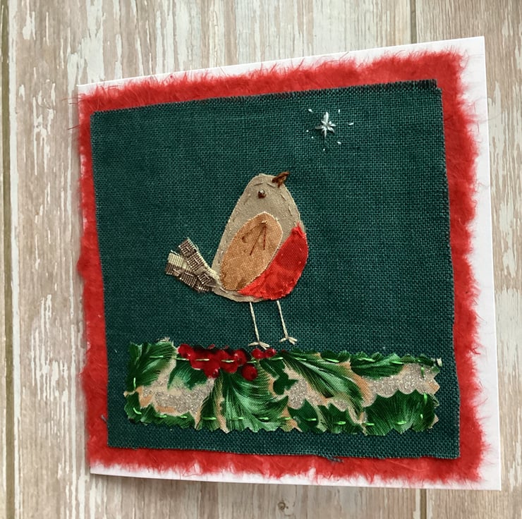 Hand stitched - a sweet little robin gazing up at the star - this is sewn onto a forest green linen background with a surround of red handmade paper and then mounted onto white card.