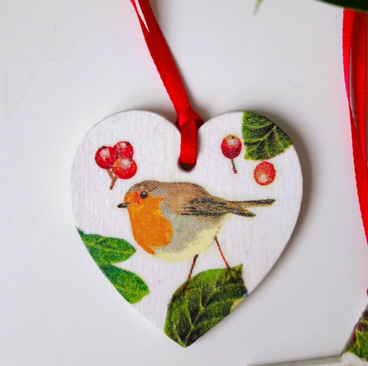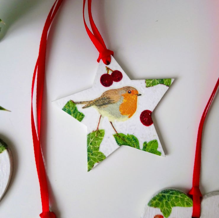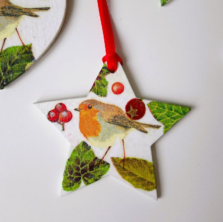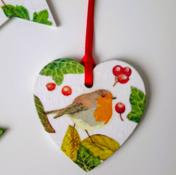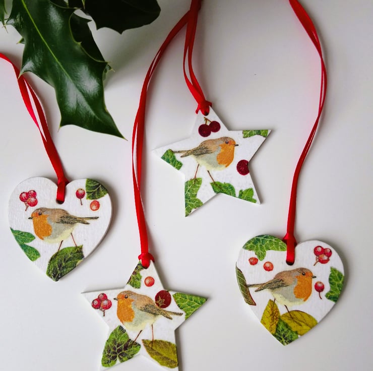 This set comprises of 4 decoupage Christmas tree decorations, with robin and berry designs. There are 2 hearts and 2 stars which are finished with a red ribbon.