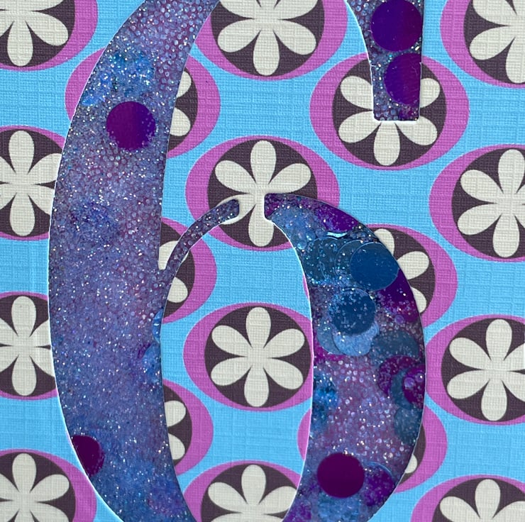 Celebrate that significant birthday in style with this lovely retro flower birthday card. This A5 card features some retro flowered paper in blue, pink, brown and cream. This is the base for the shaker card. Happy Birthday and 60th and die cut into it, it is backed with acetate, glitter and confetti is added and it is mounted on some pink sparkly card. The glitter then moves as you shake the card. The base card is a denim blue and Happy Birthday in matching paper is inside. A retro and funky way to celebrate a very significant birthday.