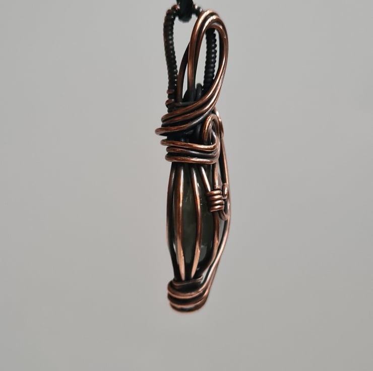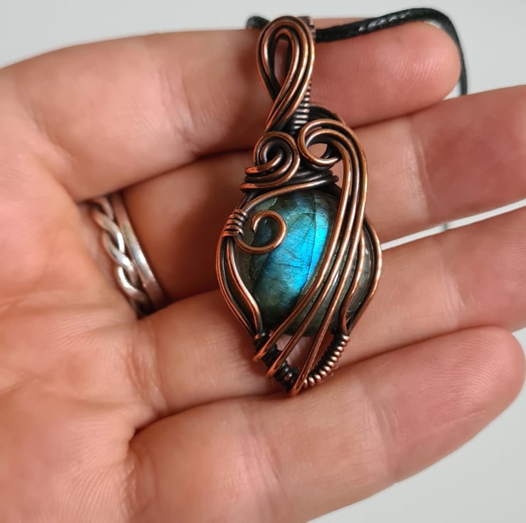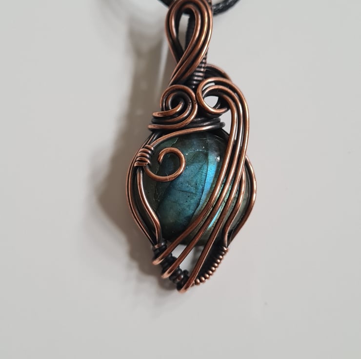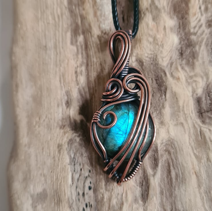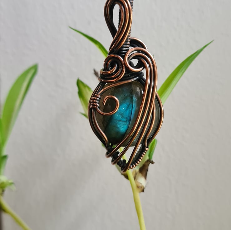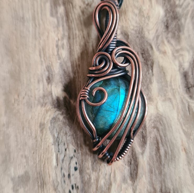 This lovely Natural Labradorite crystal is a beautiful tone of blue and I have wrapped it with copper into this unique design and then antiqued and polished for the final effect. This labradorite has a lovely energy and feel to it, looks amazing against the copper, and is a ideal unique, one of a kind gift.