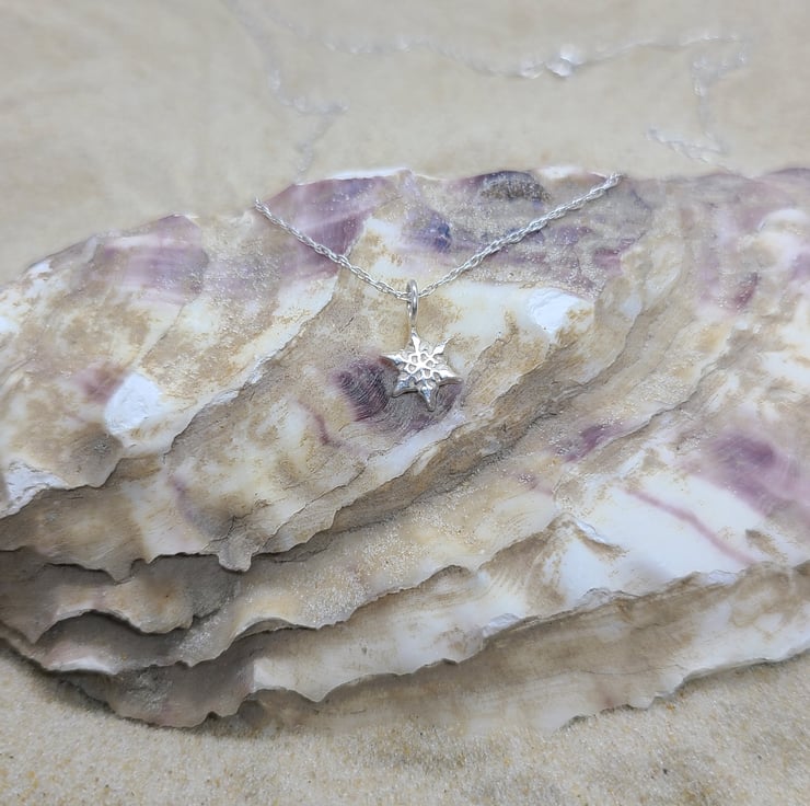 A fine silver Snowflake hung on a sterling silver rope chain.