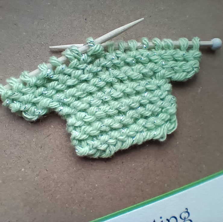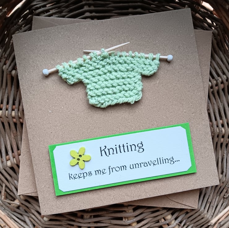 The little knitted jumper is hand knitted by myself with pale green yarn that has a silver thread running through it. It is then transferred onto my handmade little knitting needles. There might be small variations in the colours and positioning as each card is unique and handmade. The text is printed on quality paper and mounted onto green card. It is a little raised. This card is finished with a wooden flower button.