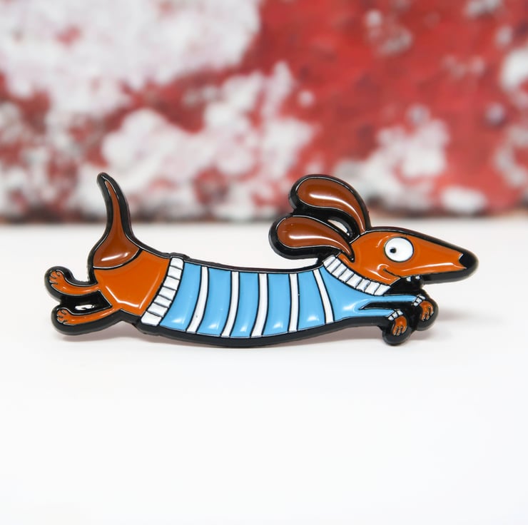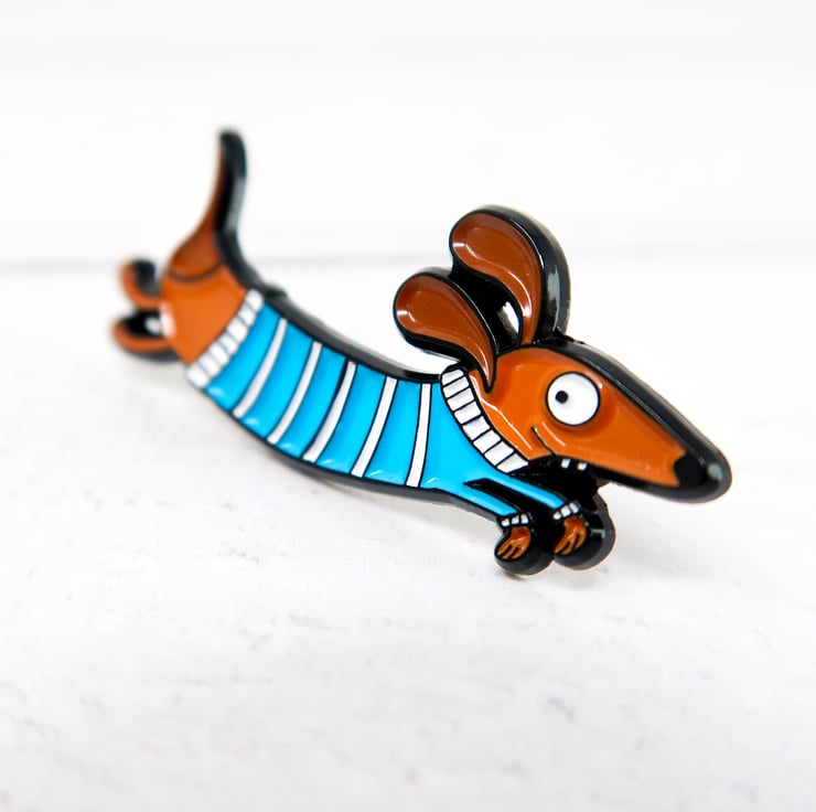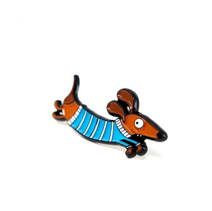This adorable enamel pin features a goofy and cheerful little sausage dog, he's all ready for his walk dressed in a cozy blue jumper.
