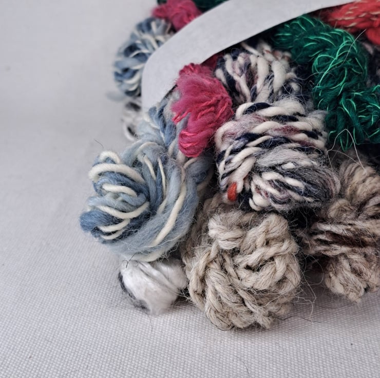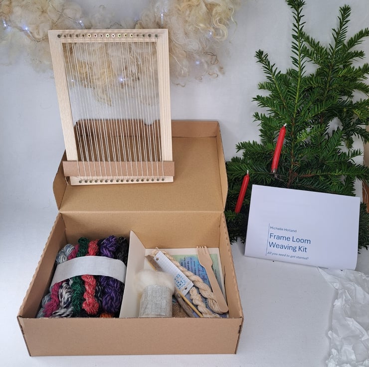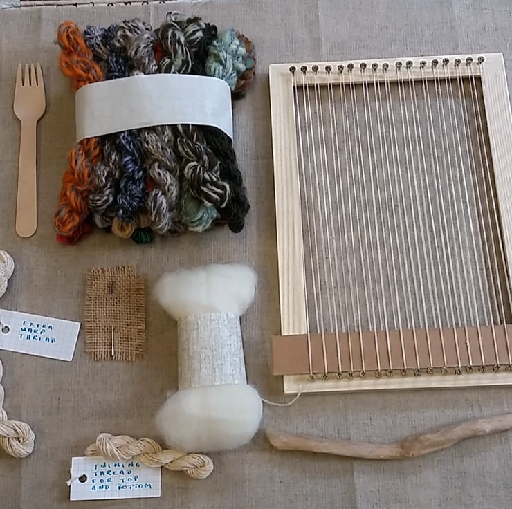All you need to start Weaving. The Kit includes a handmade 8" x 11" (20cm x 28cm), Solid Wood Weaving Loom, over 120mtrs multi colured handspun yarns enough for at least 3 projects. Detailed instructions with photos for setting up the loom, together with weaving stitches to help you create your own unique pieces of Art. How to finish off and remove from the Loom your Weaving Project. The Loom comes fully Warped to start your first piece, but there is also extra Warping Thread, Twining Thread, Tapestry Needle, Spacing Bar, Shed Stick, Wool Fleece Fork, and a piece of Driftwood to hang your work from. For postage outside the UK please message for details.
