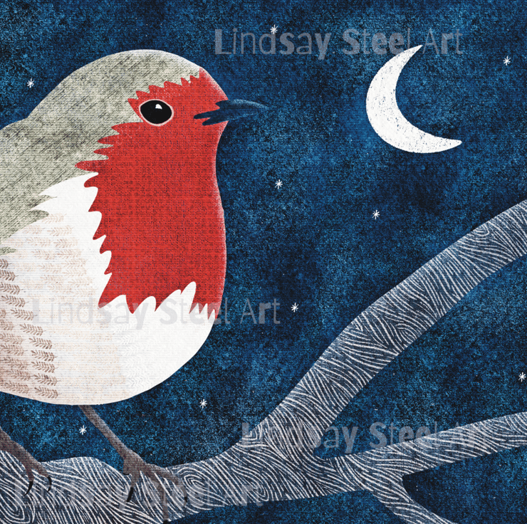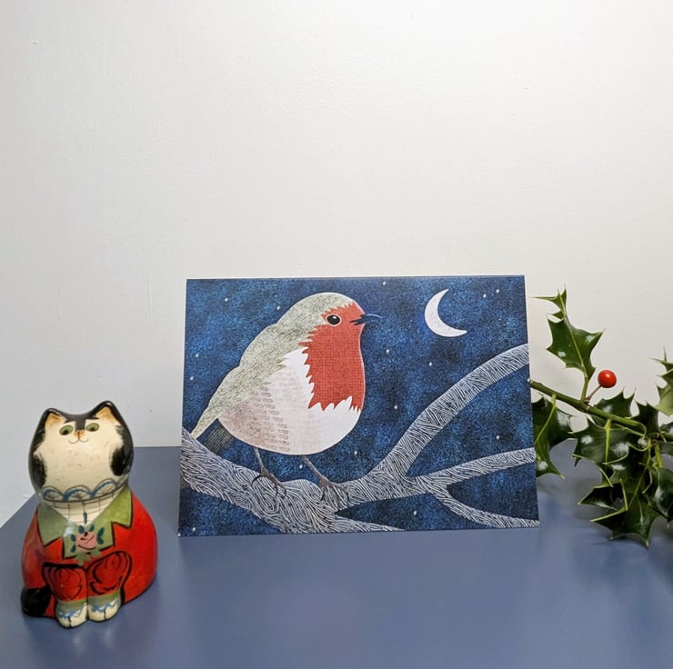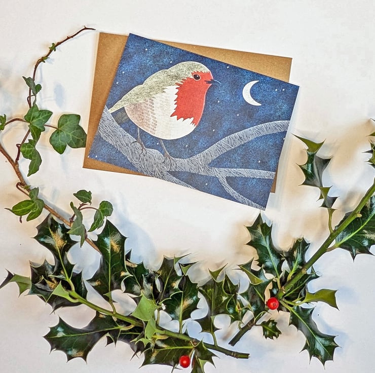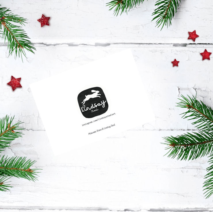 A wintery Christmas card featuring my original digital artwork Midwinter Robin.