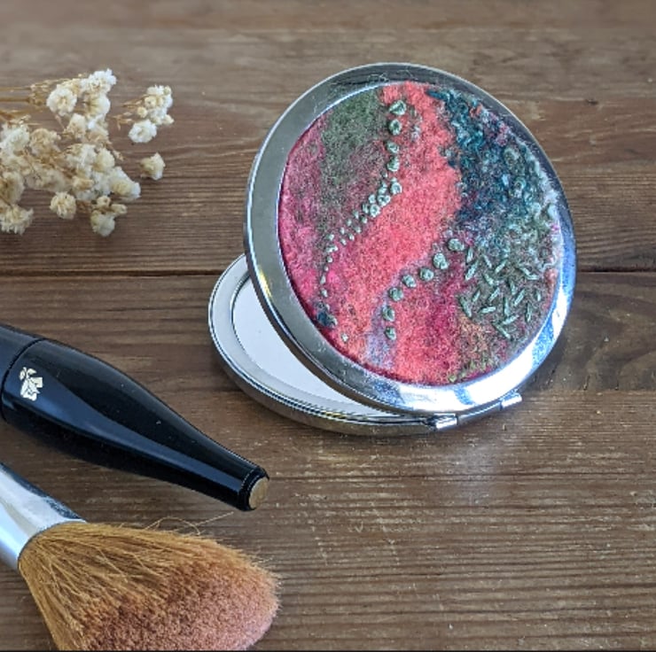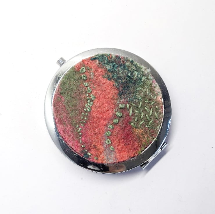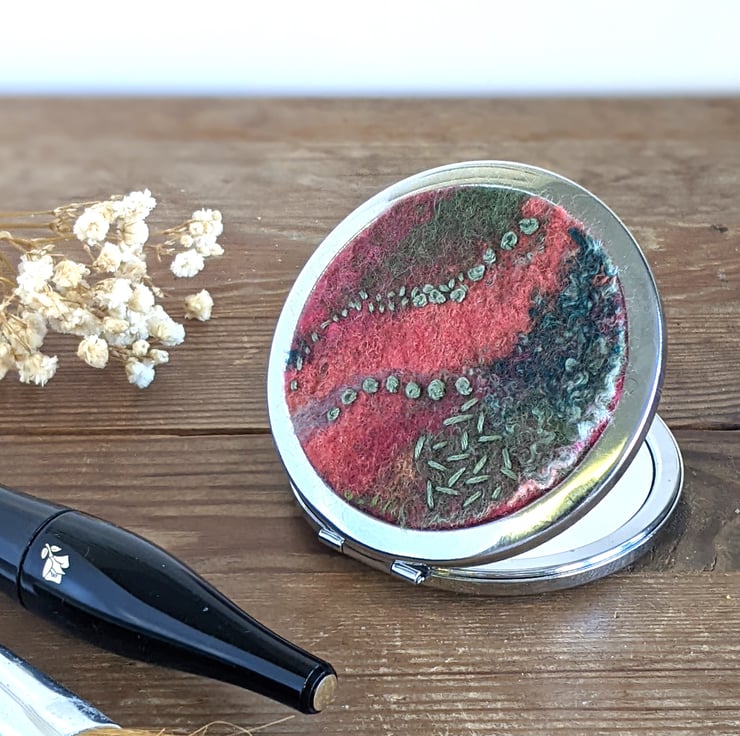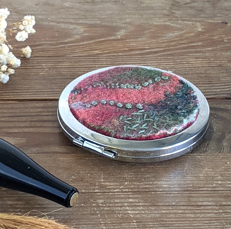 The case is inset with a handfelted inlay of merino wool in shades of terracotta and green, embellished in toning colours with hand embroidery.