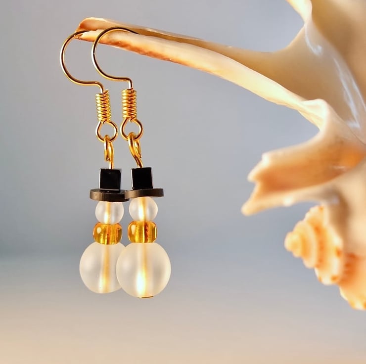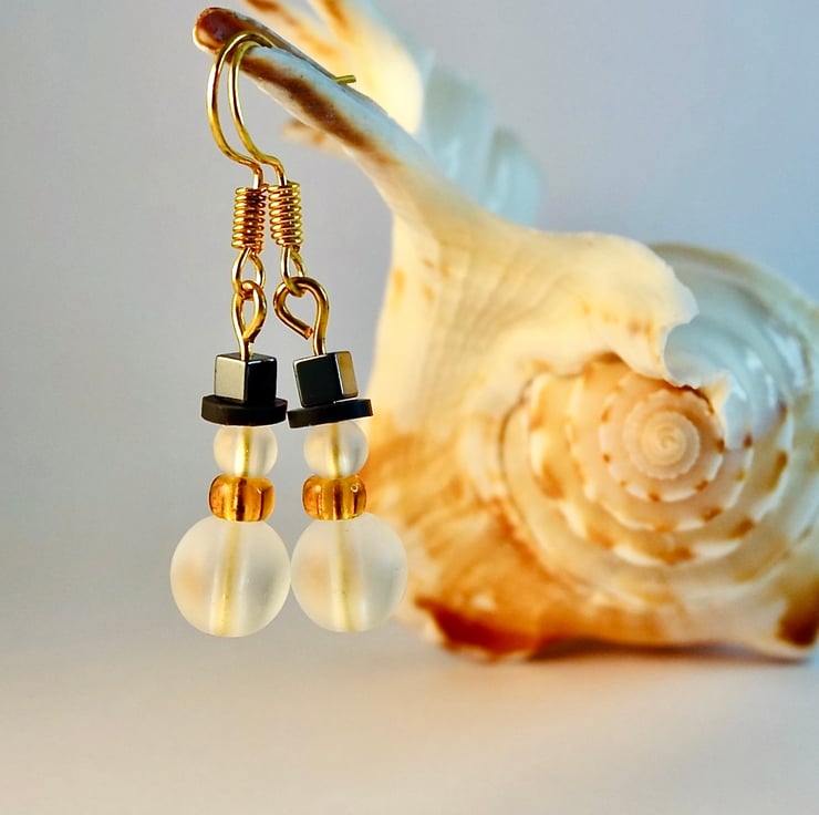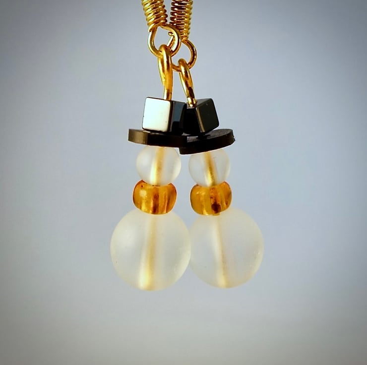 Cute little snowmen earrings, made from frosted glass beads for the body and head, with a small, shiny golden glass seed bead for a scarf and a hat made from a polymer clay disc topped with a cube of hematite.