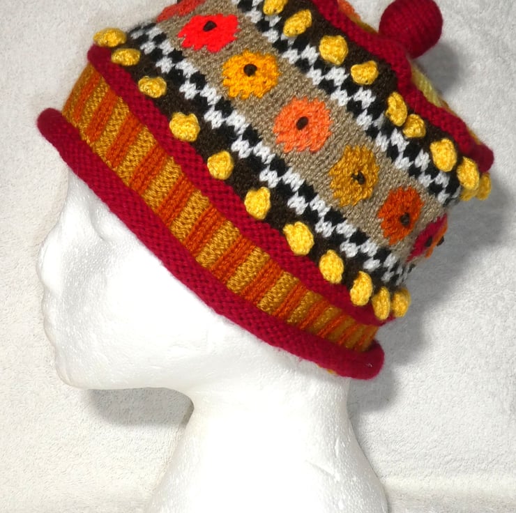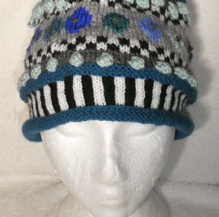 I have based this hat design on stranded colour-work knitting, incorporating circles and bobbles. It can be knit in 3 sizes, from 19" to 24.5", and is knit mostly in the round. The hat is knit in DK weight premium acrylic yarn and has a roll up brim, 2 colour rib, garter ridges and fair isle panels. There are decorative French knots and a knitted ball to complete the hat.