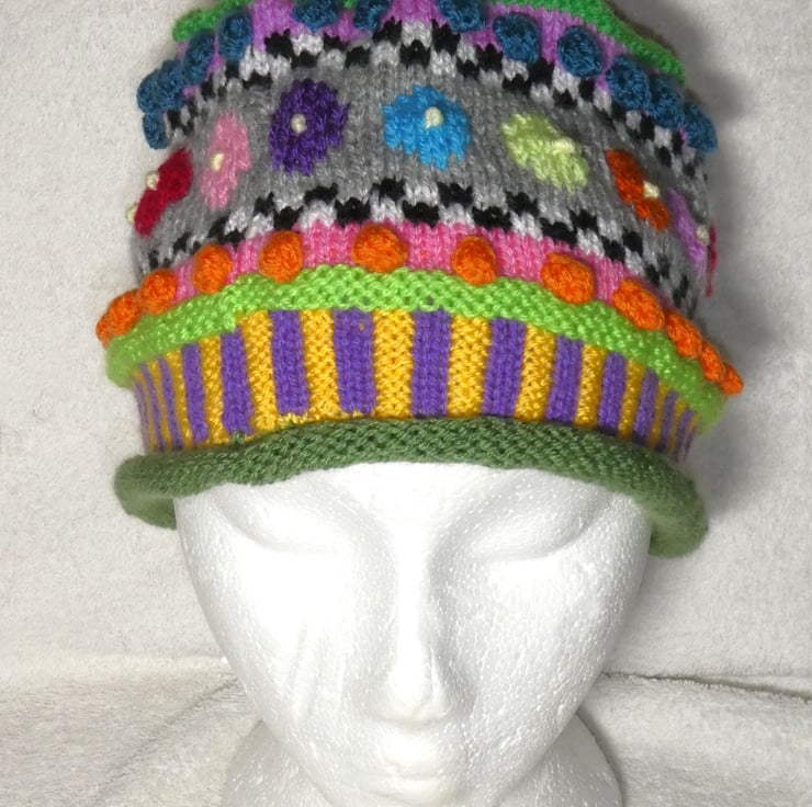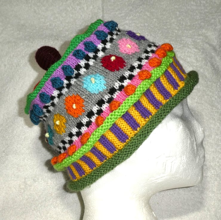I have designed and hand knit this wonderful brightly coloured hat from double knitting weight premium acrylic yarn, using fair isle techniques. The hat has a roll up brim, 2 colour rib, garter ridges and fair isle panels. There are decorative French knots and a knitted ball to complete the hat. It is knit mostly in the round, with only a small seam on the crown.