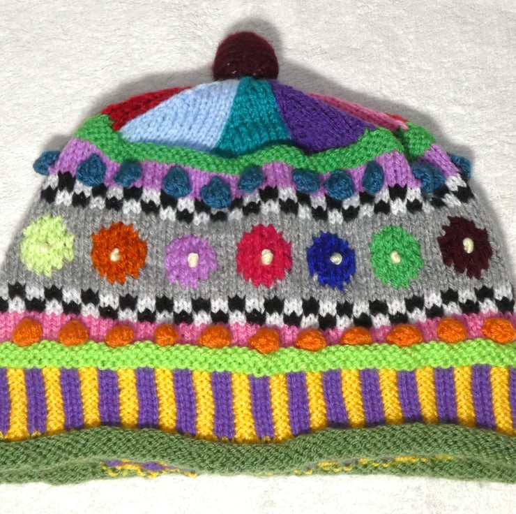 I have designed and hand knit this wonderful brightly coloured hat from double knitting weight premium acrylic yarn, using fair isle techniques. The hat has a roll up brim, 2 colour rib, garter ridges and fair isle panels. There are decorative French knots and a knitted ball to complete the hat. It is knit mostly in the round, with only a small seam on the crown.