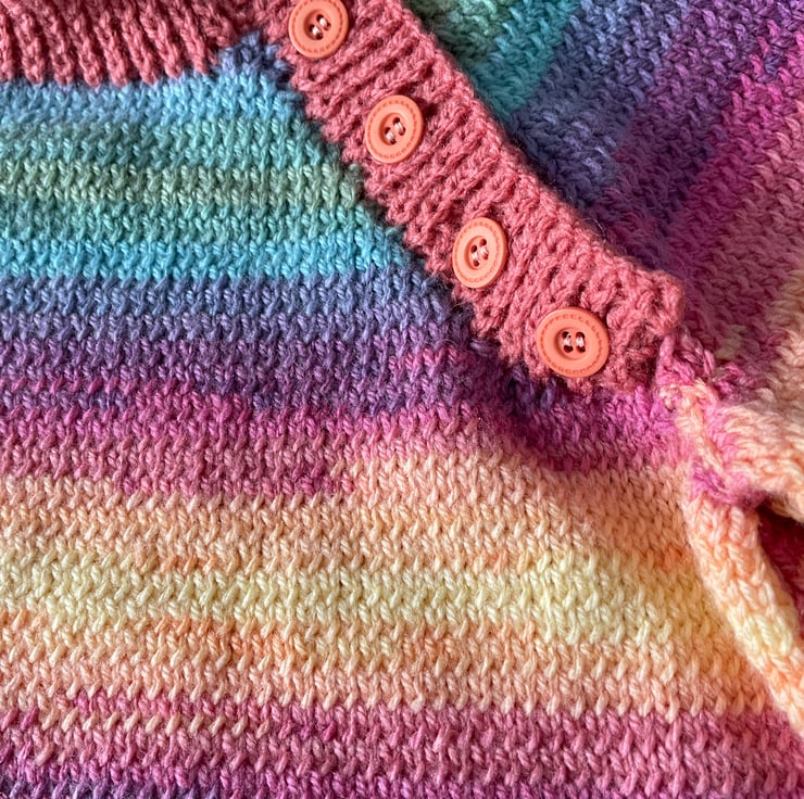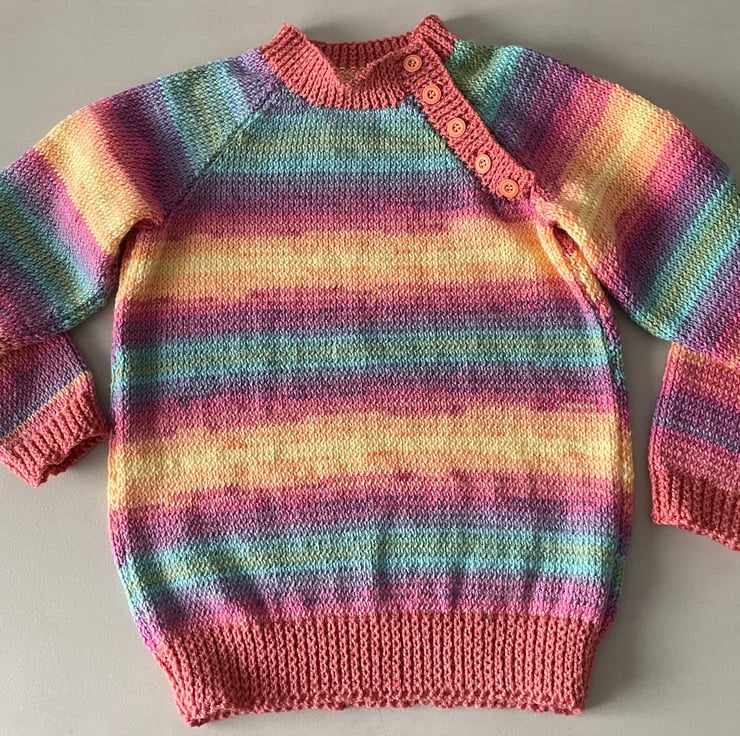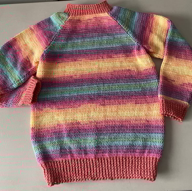 Colourful hand knitted jumper in double knitting yarn.