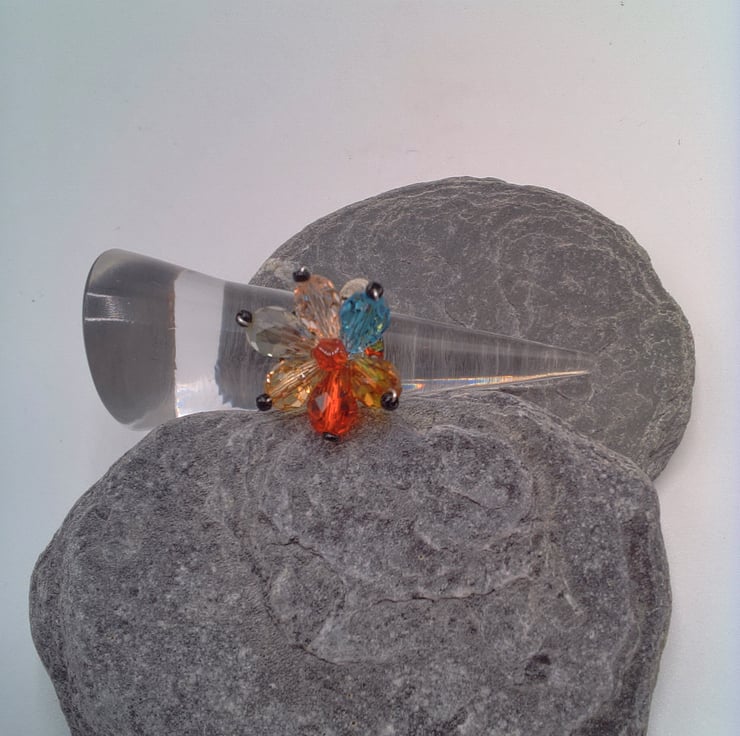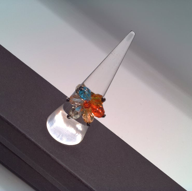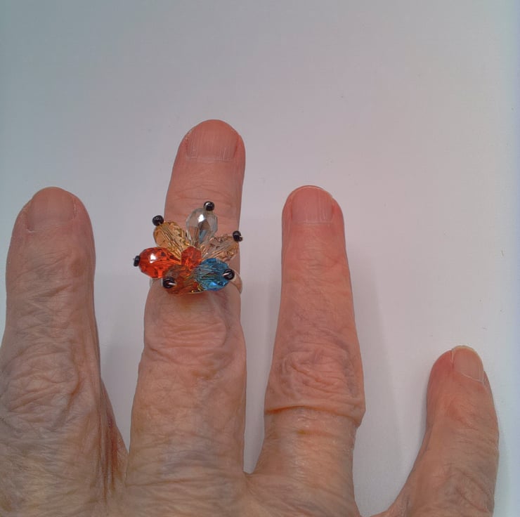 This very pretty adjustable ladies ring would go well with any of your outfits for a day out, a casual party or for an evening out. It would also make a perfect gift for a birthday or anniversary for a friend or relative, or a nice treat for yourself. The ring base is adjustable so it will fit most sized fingers and it has a beaded crystal flower attached to the silver plated ring base. The crystal beads used are 10 mm x 6 mm drop crystals in yellow, blue, smoky quartz, orange, Topaz and clear, with a central 3 mm orange round faceted bead. The ring will be dispatched wrapped in tissue paper in an organza bag and delivered to you via Royal Mail first class post. The actual shade of the beads may vary depending upon your monitor set up.