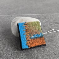 The case is inset with a handfelted inlay of merino wool in blues and terracotta, embellished in toning colours with hand embroidery.