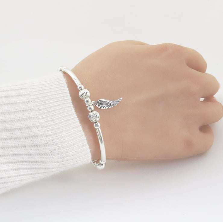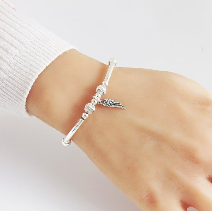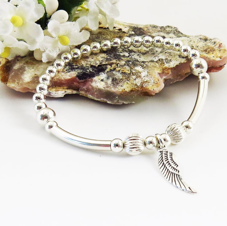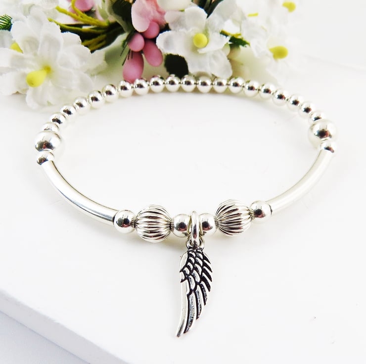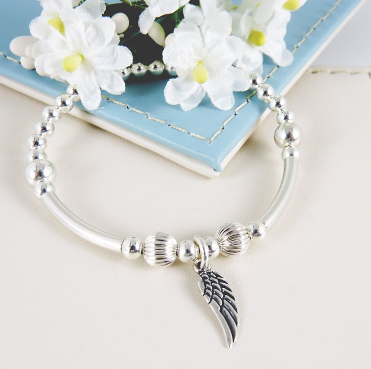 925 sterling silver beaded bracelet with a angel wing charm this bracelet will make a stunning birthday gift for someone special. memorial gift and a lovely keepsake gift.