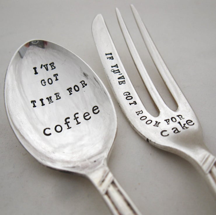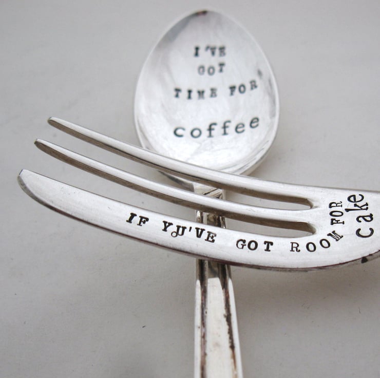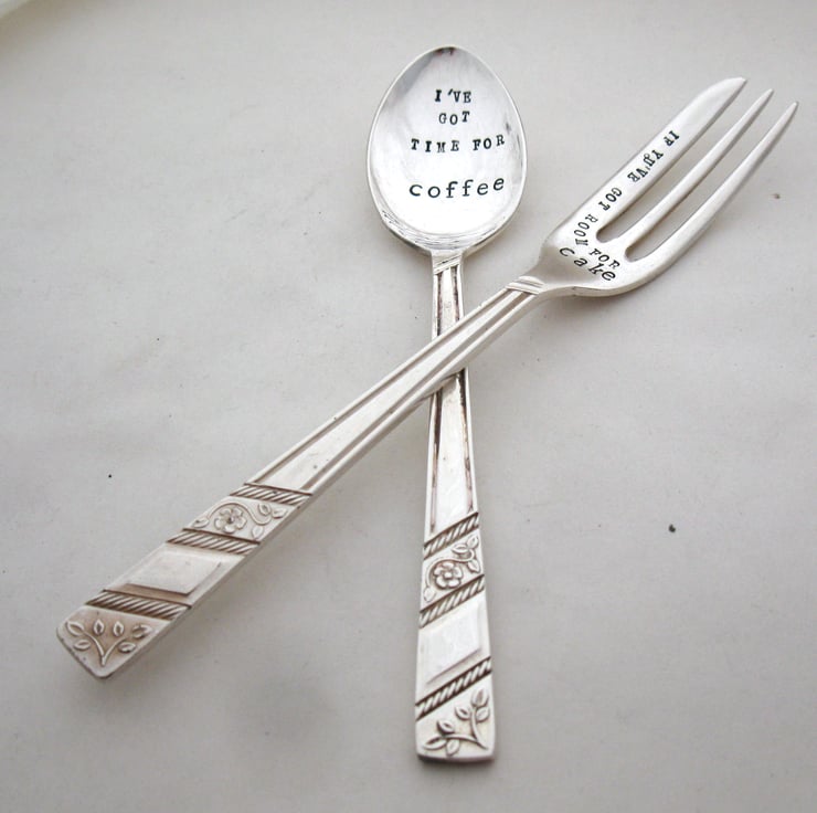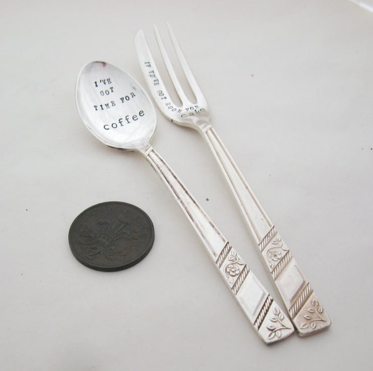 A matching floral coffeespoon and cakefork set with 'I've got time for coffee' on the spoon and 'if you've got room for cake' on the fork. Unfortunately I wasn't really concentrating when I stamped the fork, so I left the 'O' out of 'you've' and had to squeeze in a little tiny one which to be honest isn't even slightly convincing... so into the bargain bin they go, and I'll attempt a perfect iteration when I have more cakeforks and enough brain power to do backwards spelling!