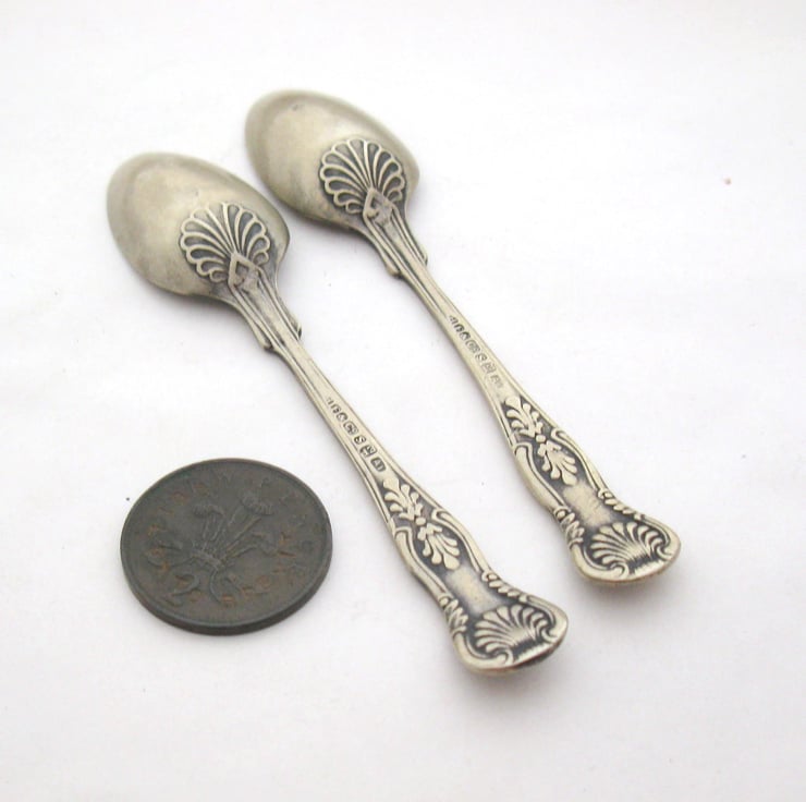 The two spoons are approx. 11cm long. They are most likely Victorian. Once upon a time they were silver-plated but they've been used, loved and polished so much that no trace of the original plating now remains and they are the slightly dull and brassy colour of their underlying base metal alloy. With a nice antiquing effect of residual tarnish in that ornate 'kings pattern' decoration (which is on the back too).