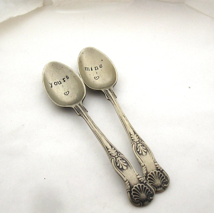 Two very old and battered ornate coffeespoons handstamped 'mine' and 'yours' with little hearts. A romantic small gift for a wedding or anniversary. Or just because.