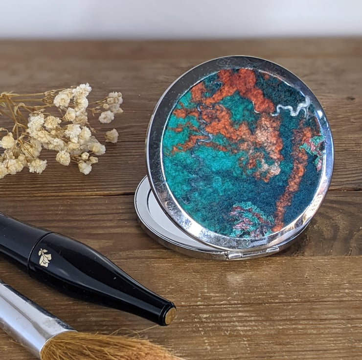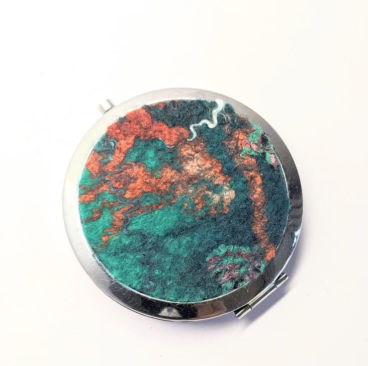 The case is inset with a handfelted inlay of merino wool in autumnal shades of greens and copper, embellished with small pieces of upcycled sari silk and silk fibres.
