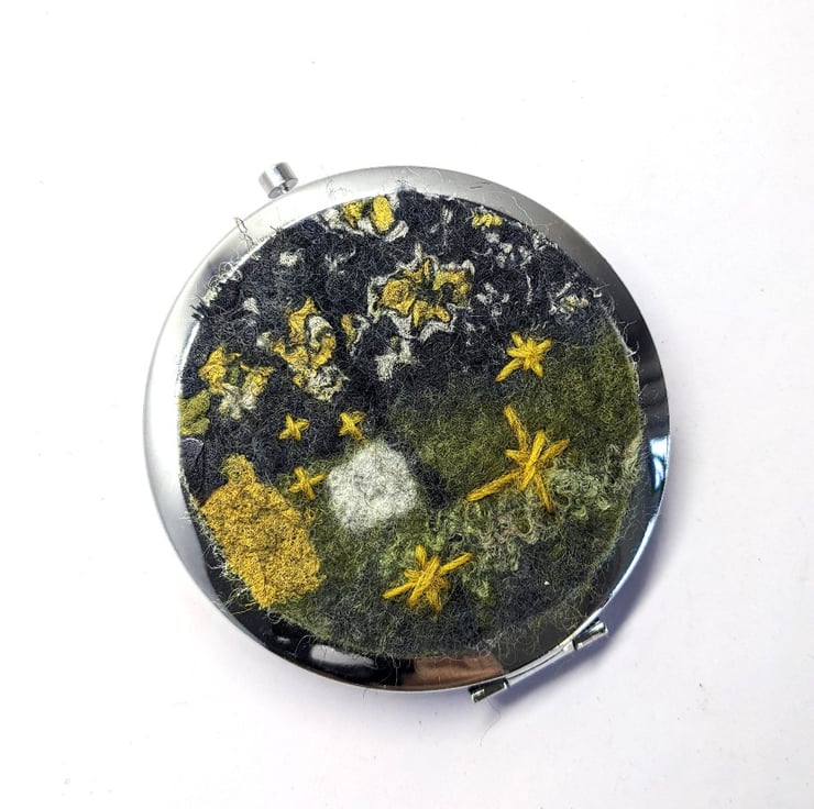 The case is inset with a handfelted inlay of merino wool in shades of black and yellows, embellished with upcycled sari silk and silk fibres and finished with toning hand embroidered stitches.