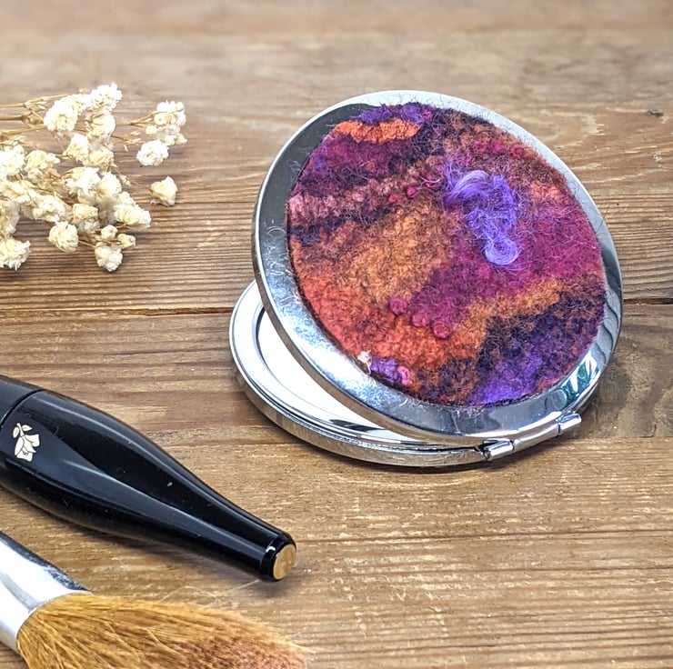 The case is inset with a handfelted inlay of merino wool in shades of ruby, purples and oranges, embellished with tiny pieces of upcycled sari silk and curly wool locks, and finished with toning hand embroidered stitches.