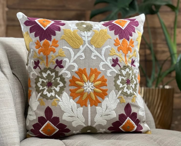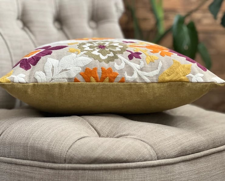 This beautifully embroidered and Spanish inspired design oozes warmth and comfort, fitting for any space around the house. One sided and Backed in a soft fern tone.