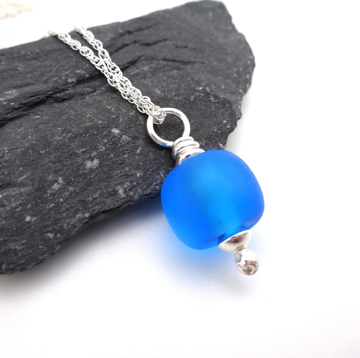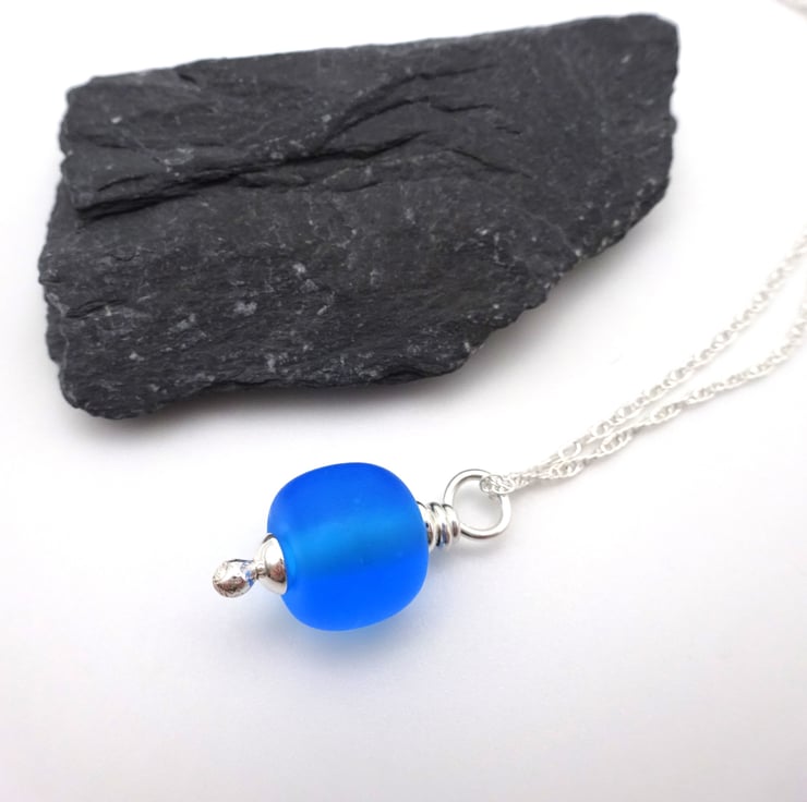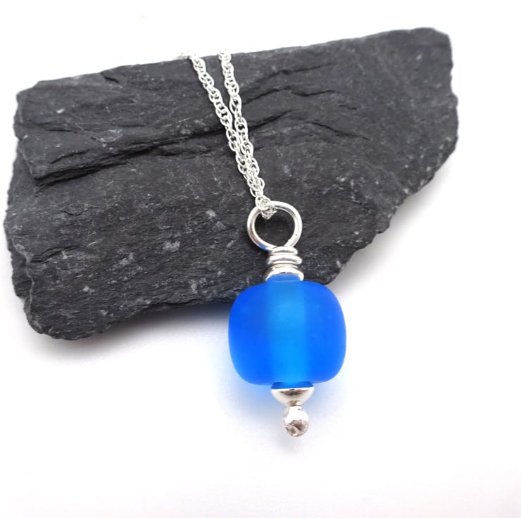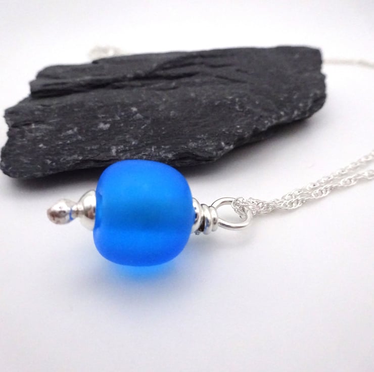 It features a handmade lampwork blue frosted glass pendant strung onto a sterling silver chain.