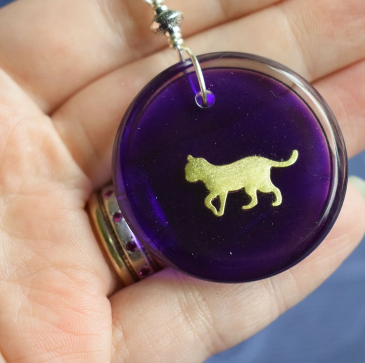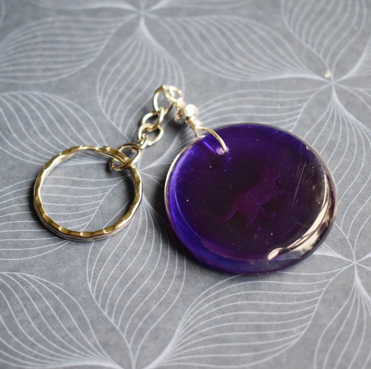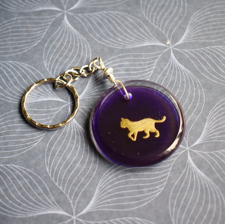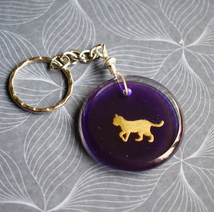 The golden cat silouette sits on a deep purple background in a clear resin pendant. It is attached to a sturdy silverplated split ring keyring and is a great little gift whether as a treat to yourself or for someone else.