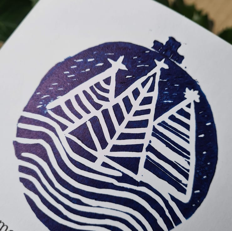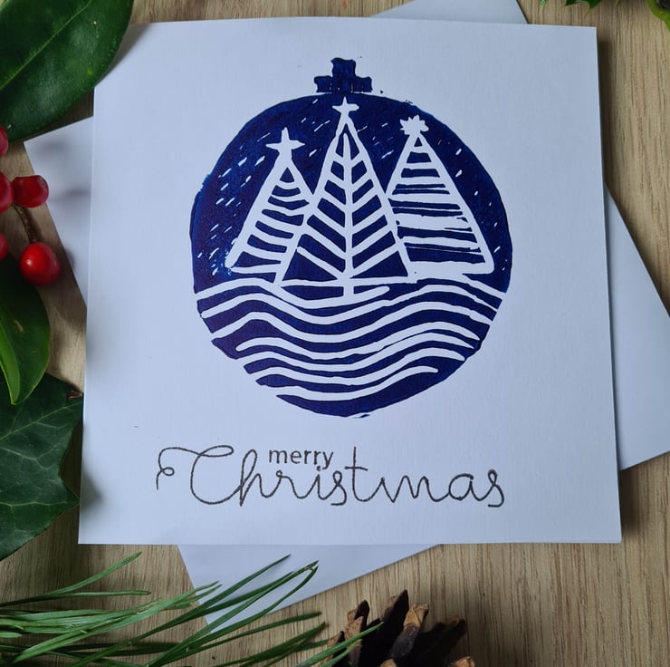 This bauble design christmas card has been handprinted from my own linocut design. A handmade card is lovely to give close friends and family.