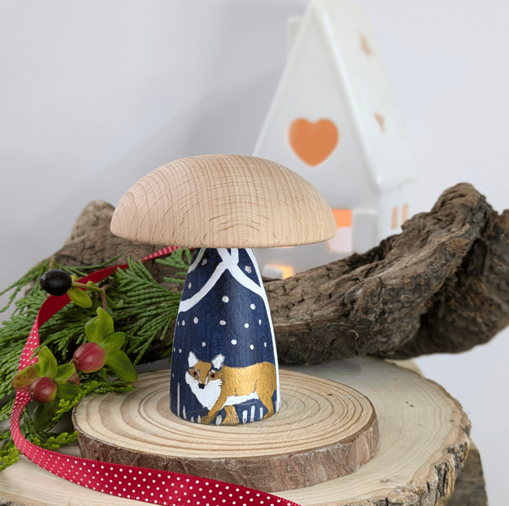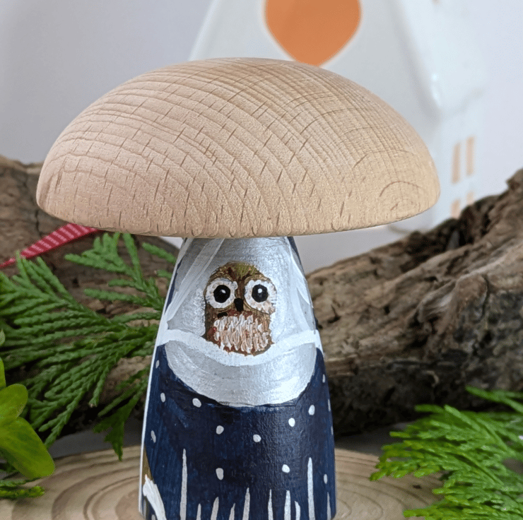 Handpainted on a beech wood toadstool which is 8cm tall and the cap is about 6.5cm across