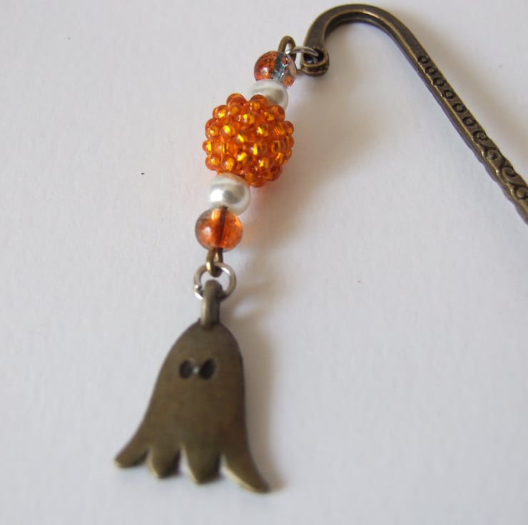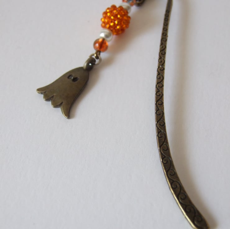 Shepherd's hook embossed bronze metal bookmark with antique bronze ghost charm, orange beaded bead, pearl beads, transparent orange round glass beads.