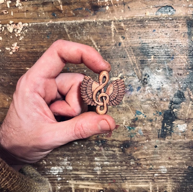 This angled winged treble clef is hand carved from linden wood and finished with a blend of natural oils and wax polish.
