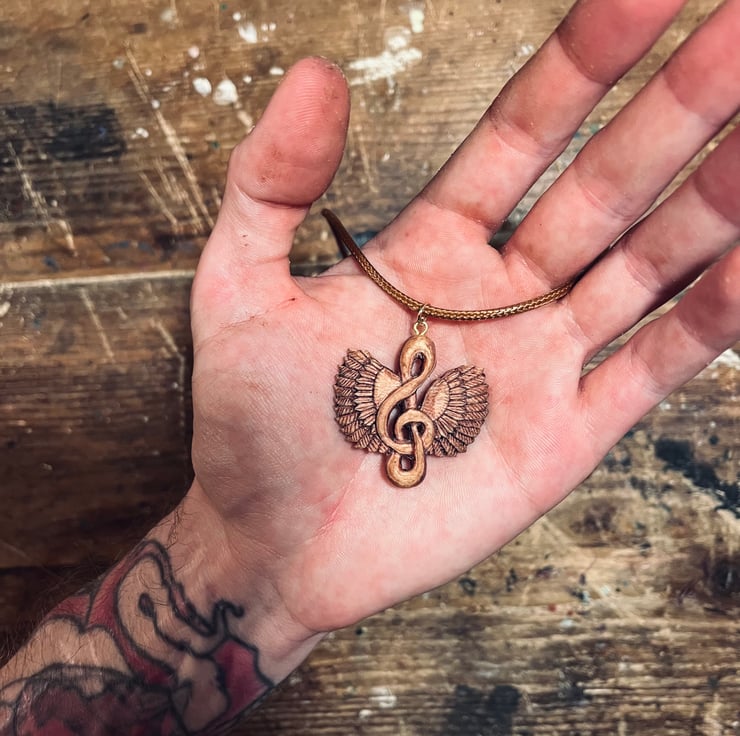 A hand carved treble clef with angel wings on a brown wax cord necklace with vintage brass clasps.