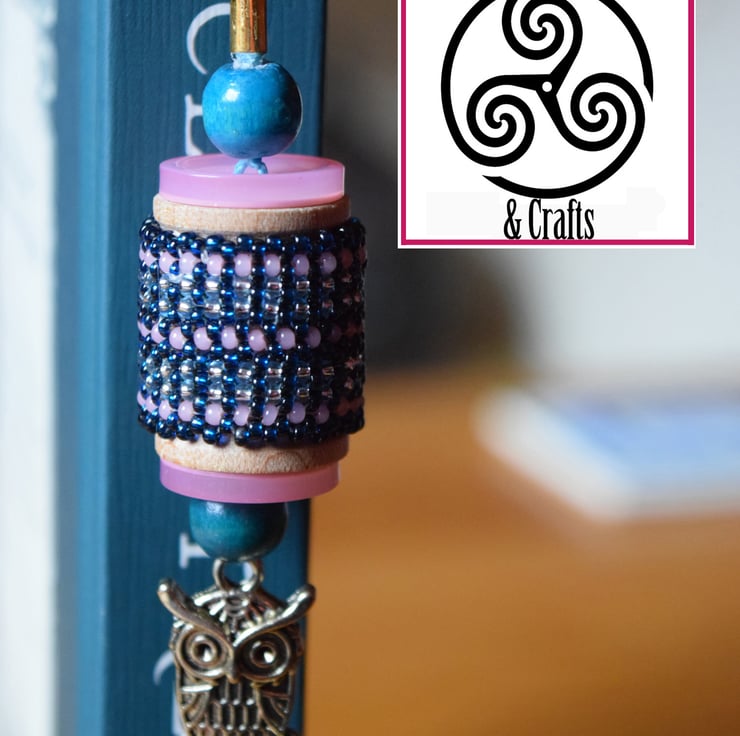 The bookmark itself measures 16.5 cms in length whilst the owl, bobbin and beads dangles approx 3.5 inches from the curved end.