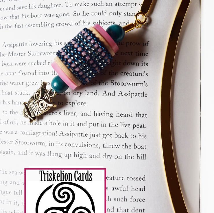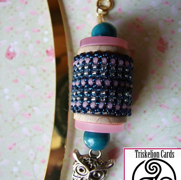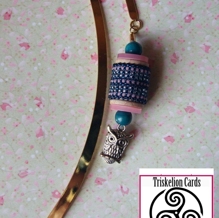 Gold plated curved metal bookmark with beaded wooden cotton reel or bobbin and gold plated owl charm.
